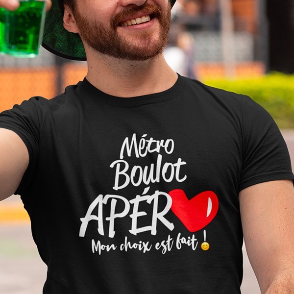 Toujours très difficile de choisir entre le travail et l'apéro, non ? Si on y rajoute le métro, le choix devient beaucoup plus évident ! French Tshirt a tourné en dérision le fait de choisir entre le travail et les loisirs, de notre côté le choix est vite fait, le message de notre tee shirt humour boulot devrait vous mettre sur la voie.